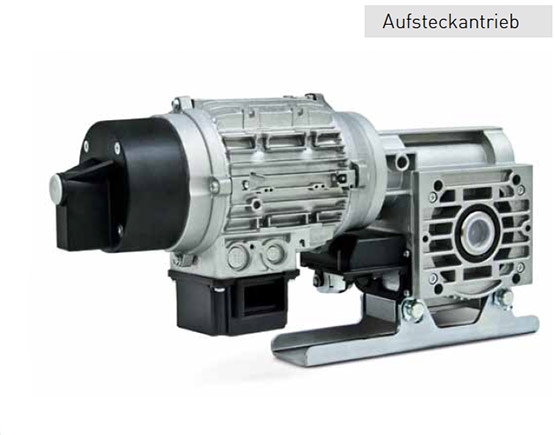 Réducteurs de sécurité à vis sans fin ne nécessitant aucune maintenance, entièrement étanches à l’huile avec unité de fin de course intégrée comprenant une manivelle d’urgence et un dispositif manuel à chaîne – similaire à l’installation du moto-réducteur, avec toutefois les roues à chaîne en acier nécessaires et la chaîne à rouleaux adaptée pour le transfert de la force de la motorisation à l’arbre d’enroulement.