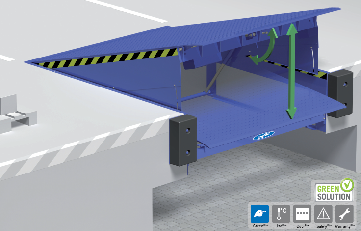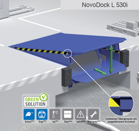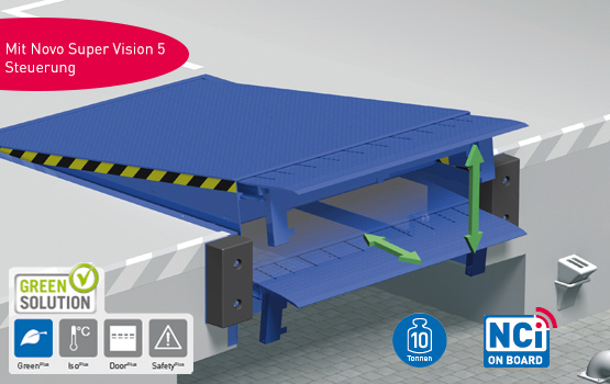 et également servir de base pour un sas de chargement. La commande i-Vision intégrée permet l’utilisation sûre et confortable des niveleurs de quai. Comme tous les produits Green Solution, les NovoDock P 1500i et P 1300i génèrent également des économies grâce à la réduction de CO2.