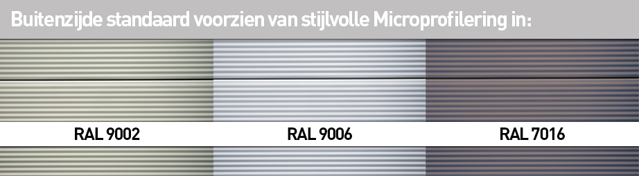 - Buitenzijde standaard voorzien van stijlvolle Microprofilering in RAL 9002, 9006 of 7016