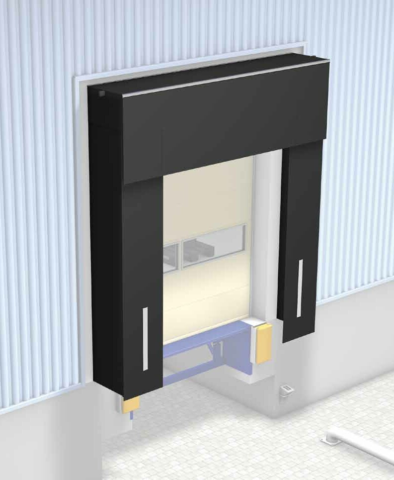 Novoferm shelters met indrukbare voorzijde beschermen tegen tocht, regen en wind. Dit product is een perfecte afdichting tussen de vrachtwagen en een gebouw. Deze shelter voorkomt energieverlies en ook het beschadigen van de lading. In de zijdelen bevinden zich geen armen, hendels, scharnieren of stangen. Deze shelters zijn praktisch “onverwoestbaar”. De zijdelen bestaan uit een schuimkern en wijken zijwaarts uit als een vrachtwagen schuin of uit het midden rijdt, volledig onafhankelijk van het dakdeel.